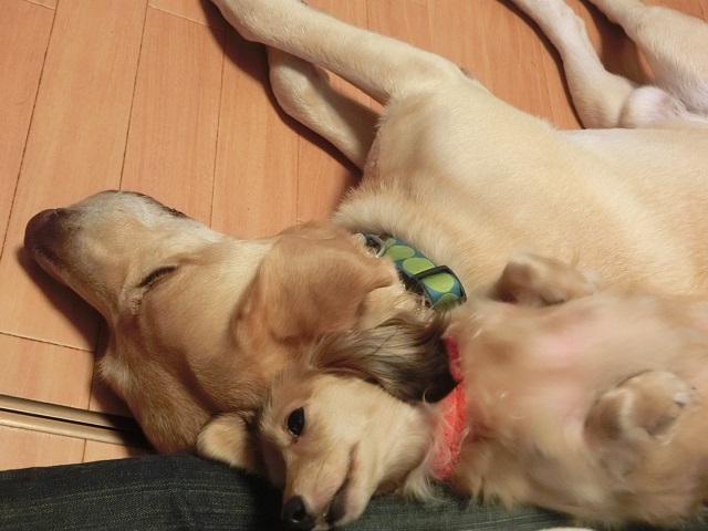 人間の足とわんこの背中を上手に使って夢うつつ…なんて贅沢な!!