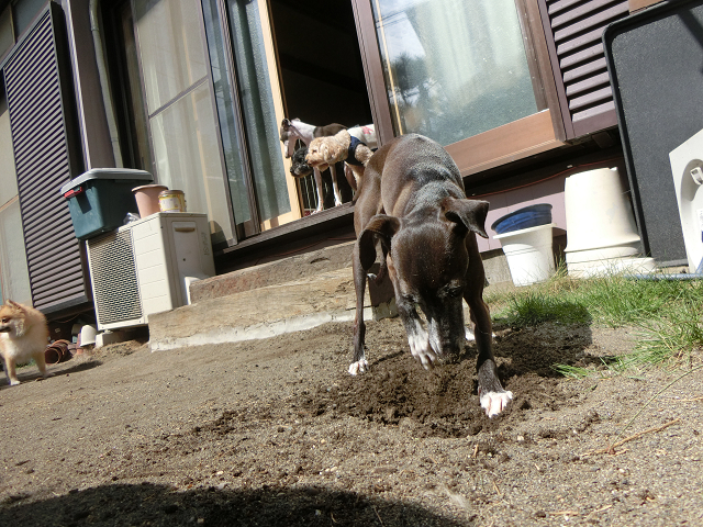 「ここ掘れ・・ここ掘れ!」ワンワンとは言わなかったですが、イタリアングレイハウンドくん何やらものすごい集中力で、お取込み中です。