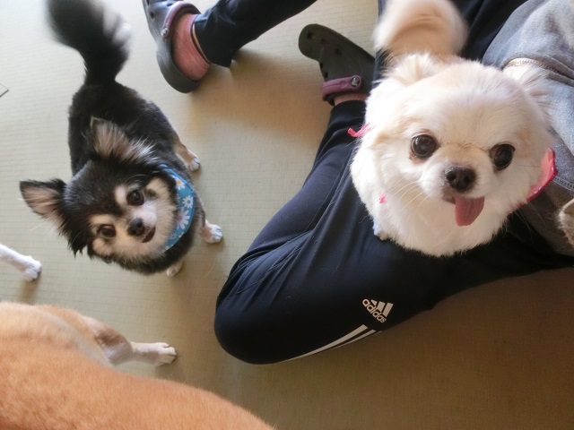 スタッフの膝の上でしばし休憩です。とってもとってもマイペースなチワワ兄弟。