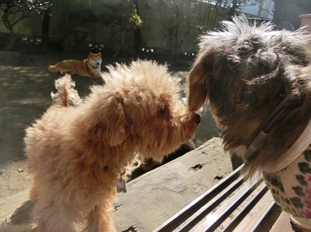 お天気の日の窓辺でなにやらヒソヒソ。毎日一緒に過ごしている長期滞在組のふたり。