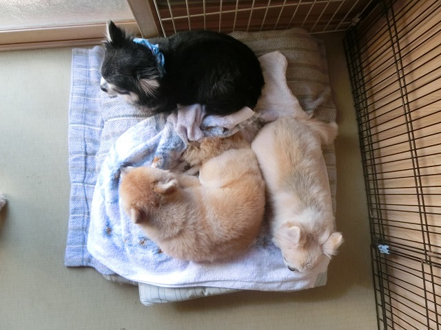 パズルのようにぴったり収まる御三方。チワワ、ポメ、チワワ。