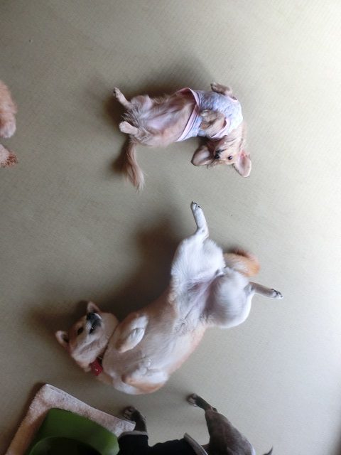 日当たりの良いお庭でひとしきり遊んだあと、陽射しのそそぐ暖かいお部屋で、柴姉さんが始めると、大の仲良しのカニヘンちゃんが近づいてきて、一緒になってヨガなのか運動後のストレッチなのか、はたまたブレイクダンスなのか・・・?