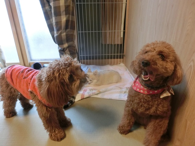 きれいなレッドの毛色がお揃いのふたり。ちょっぴり緊張気味だったトイプーちゃんですが、