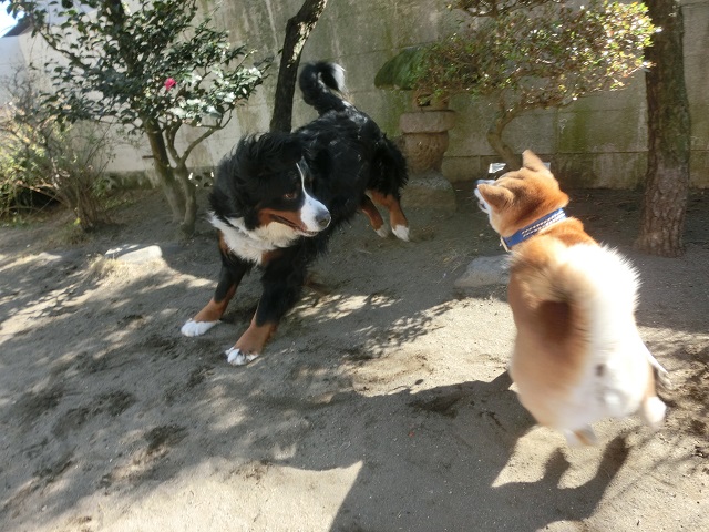 お互いうまく駆け引きをしながら上手に遊んでいました。普段はおっとりのバーニーズちゃんも