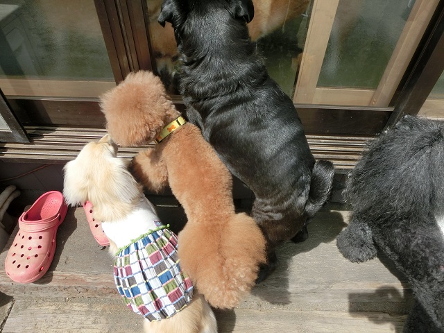 窓の向こう岸では、順番待ちの?ポメくんが今か今かとお庭へ出るのを待っています(笑)