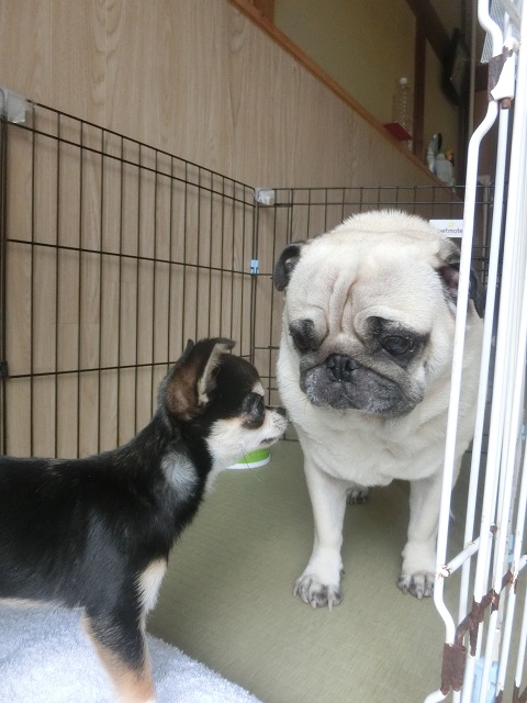 おっとりパグちゃんにごあいさつ。先輩パグくんも優しく接してくれていますね。