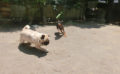 ふと、みんなの人気の枕木スペースを見ると、シニアのヨーキーちゃんに寄り添って、ステップを一緒に上がろうとしてくれています。