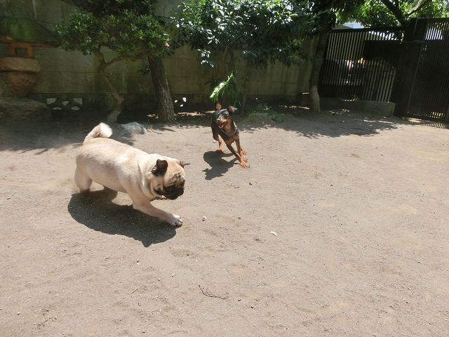 一生懸命走って、遊びに誘って、パグちゃんの緊張をほぐしてくれている様子です・・・
