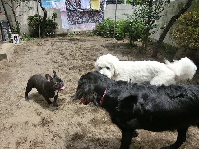 初対面だったフレブルちゃんと、ゴールデンドゥードルちゃん、フラットちゃんのパピートリオ。