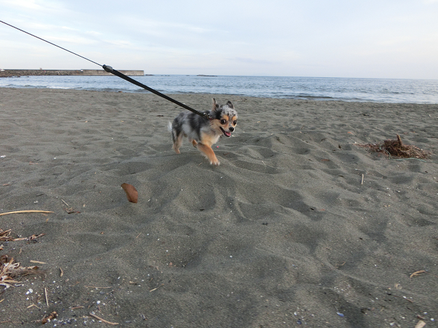 お散歩で、海に到着すると、勢いよく海に向かって「行くよー!」で一緒に猛ダッシュ、「あれれっ!」と、途中で急ブレーキ・・・